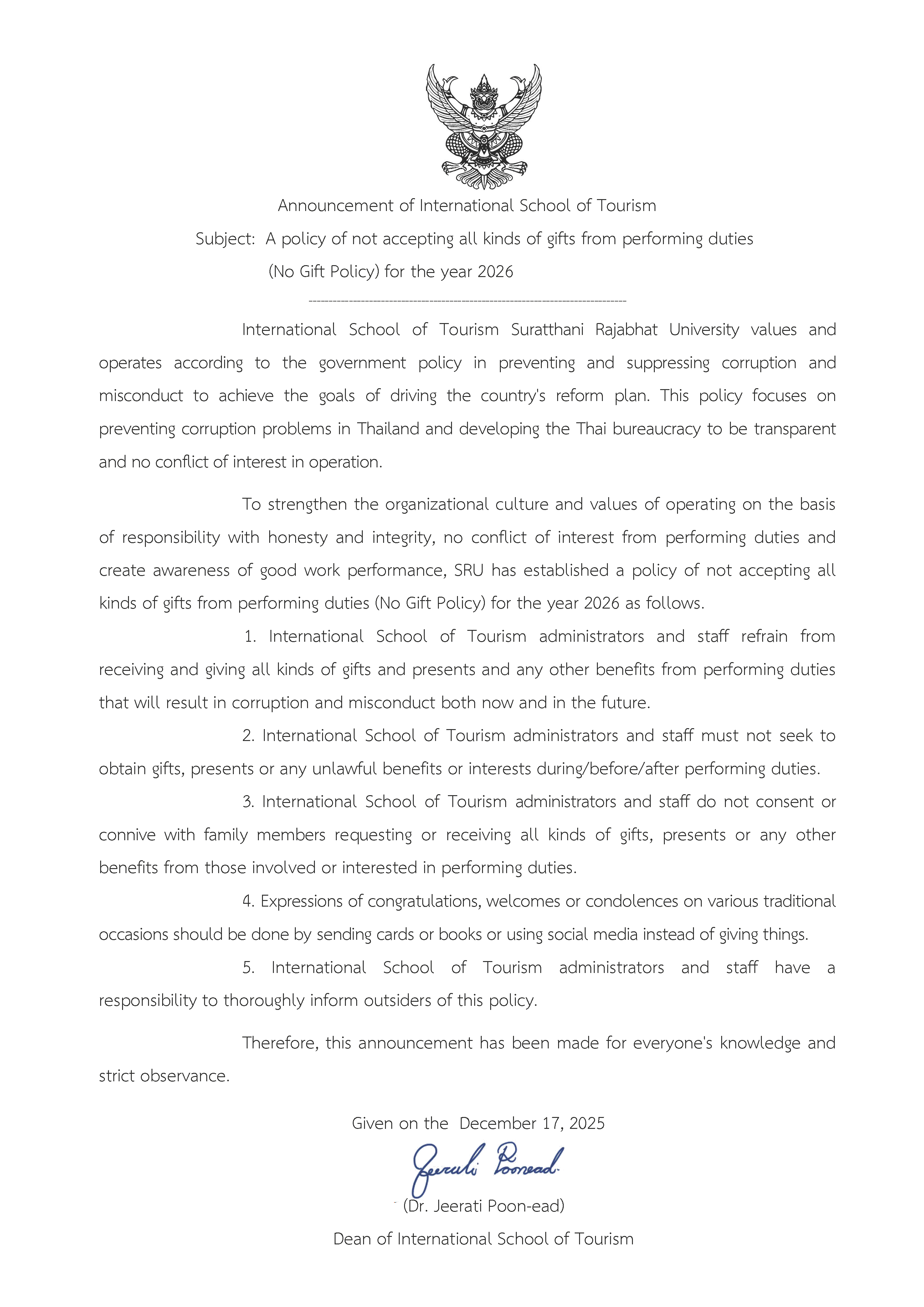 272 International School of Tourism, Chalerm Phra Kiat 80th Anniversary Building, 7th Floor, Suratthani Rajabhat University