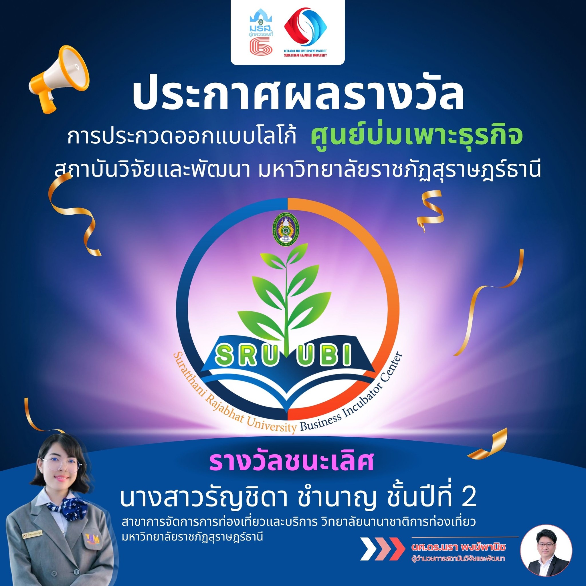 วิทยาลัยนานาชาติการท่องเที่ยว มหาวิทยาลัยราชภัฏสุราษฎร์ธานี ขอแสดงความยินดีเป็นอย่างยิ่งกับ นางสาวรัญชิดา ชำนาญ นักศึกษาชั้นปีที่ 2 สาขาวิชาการจัดการการท่องเที่ยวและบริการ ที่ได้สร้างสรรค์ผลงานอันโดดเด่น จนคว้ารางวัลชนะเลิศอันดับที่ 1 จากการประกวดออกแบบโลโก้ใหม่ของศูนย์บ่มเพาะธุรกิจ (University Business Incubator: UBI) สถาบันวิจัยและพัฒนา มหาวิทยาลัยราชภัฏสุราษฎร์ธานี