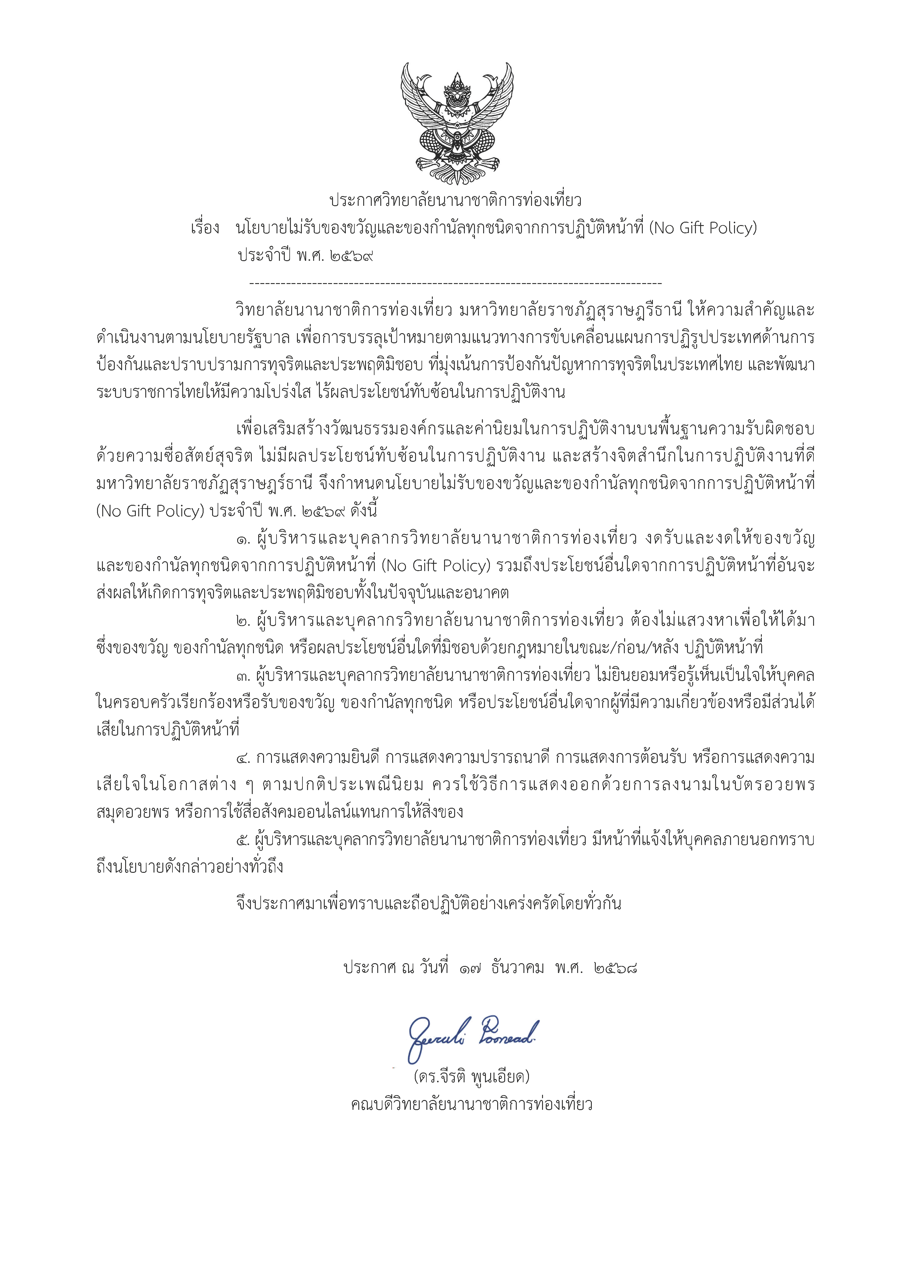 วิทยาลัยนานาชาติการท่องเที่ยว อาคารเฉลิมพระเกียรติ 80 พรรษา ชั้น 7 เลขที่ 272 หมู่ 9 ตำบลขุนทะเล อำเภอเมือง จังหวัดสุราษฎร์ธานี รหัสไปรษณีย์ 84100